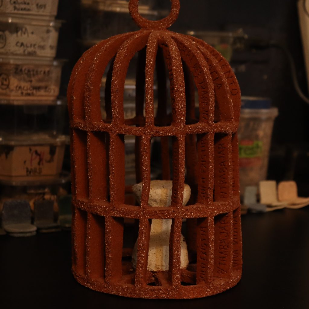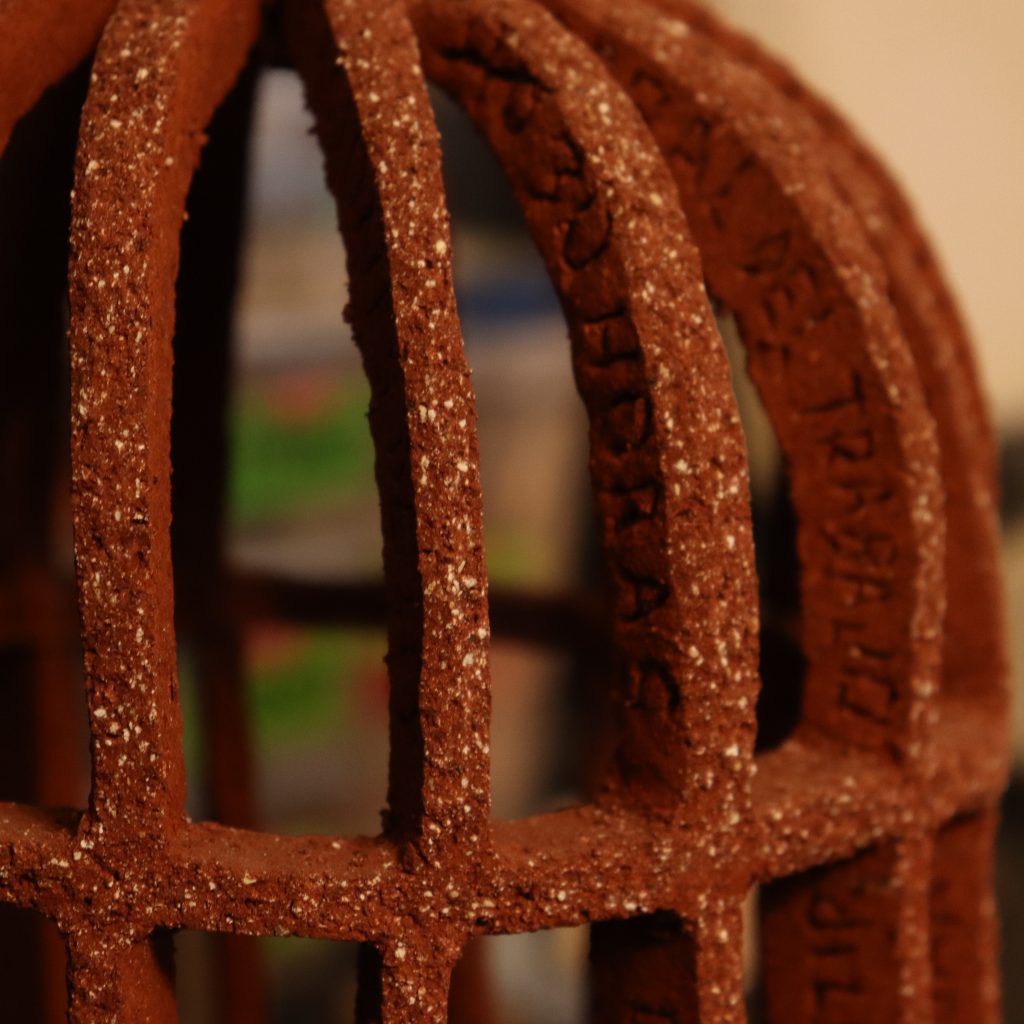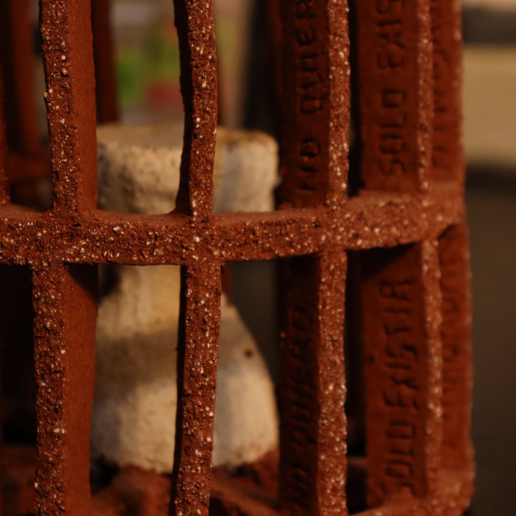 Las esculturas de Mariajose Echeverría son una manera de enmendar la arquitectura con el arte, la función con el ornamento, y así mismo, enmendar su accidentada trayectoria por la arquitectura con su pieza “¿Cuál jaula de oro?”, en la que plasma frases y prácticas negativas que se repiten dentro del gremio.